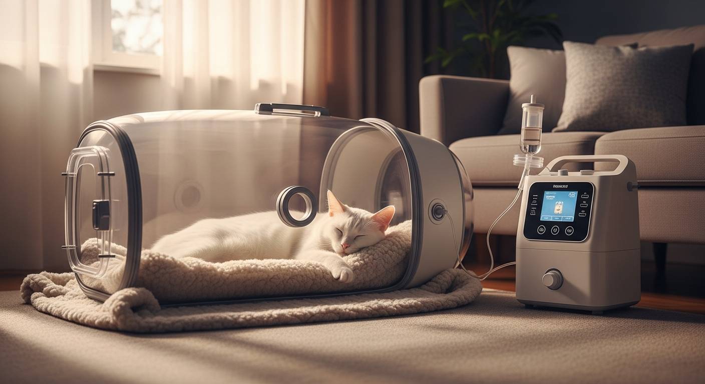 ご飯を食べない原因が「味の好み」や「飽き」ではなく、「息が苦しくて食べる余裕がない」ことにある場合、酸素濃縮器を用いた在宅酸素ケアが状況を大きく好転させる可能性があります。高濃度の酸素を吸入できる酸素室(酸素ハウス)を利用することで、猫はより少ない呼吸数で十分な酸素を体内に取り込めるようになります。これにより呼吸に伴う身体的負担が軽減され、心身に余裕が生まれるのです。